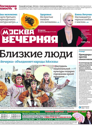 «Вечерняя Москва» — ежедневная российская вечерняя газета, старейшее из вечерних изданий в России, учрежденное в 1923 году. Выходит пять дней в неделю, кроме субботы и воскресенья. Отличается тем, что рассказывает о событиях еще не завершившегося дня. Оперативно освещает хронику и особенности жизни Москвы, охватывает все слои общества и большинство профессиональных и возрастных групп читателей.Издание представлено тремя выпусками – утренним ежедневным, вечерним (выходит три раза в неделю), еженедельным (выходит по четвергам).
