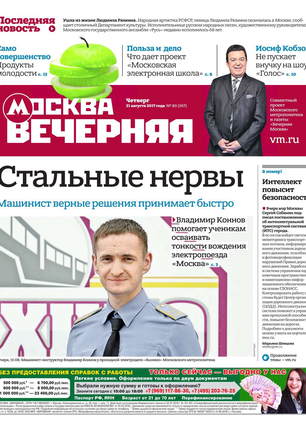 «Вечерняя Москва» — ежедневная российская вечерняя газета, старейшее из вечерних изданий в России, учрежденное в 1923 году. Выходит пять дней в неделю, кроме субботы и воскресенья. Отличается тем, что рассказывает о событиях еще не завершившегося дня. Оперативно освещает хронику и особенности жизни Москвы, охватывает все слои общества и большинство профессиональных и возрастных групп читателей.Издание представлено тремя выпусками – утренним ежедневным, вечерним (выходит три раза в неделю), еженедельным (выходит по четвергам).