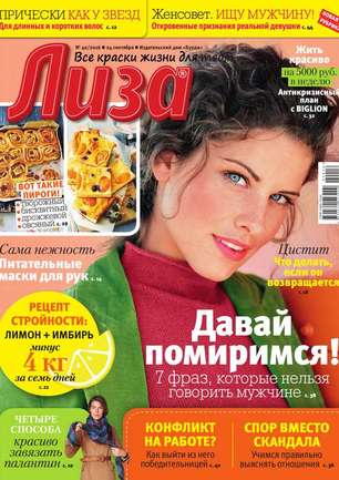 Самый популярный в России еженедельный журнал для молодых женщин «Лиза» стал еще интереснее, еще привлекательнее для читательниц. Теперь больше знаменитостей на страницах любимого журнала! Фитнес со звездой и звездный макияж, уроки стиля и самые горячие новости из жизни кумиров. А еще — модный шопинг, актуальная мода, новинки косметики и великолепные идеи для дома. Романтические истории о настоящей любви и рассказы читательниц о разных жизненных ситуациях. Аспекты психологии, секреты успешных отношений с окружающими и искусство сохранения любви.