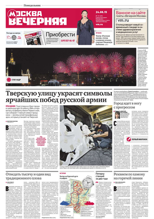 «Вечерняя Москва» — ежедневная российская вечерняя газета, старейшее из вечерних изданий в России, учрежденное в 1923 году. Выходит пять дней в неделю, кроме субботы и воскресенья. Отличается тем, что рассказывает о событиях еще не завершившегося дня. Оперативно освещает хронику и особенности жизни Москвы, охватывает все слои общества и большинство профессиональных и возрастных групп читателей.Издание представлено тремя выпусками – утренним ежедневным, вечерним (выходит три раза в неделю), еженедельным (выходит по четвергам).