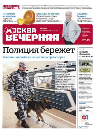«Вечерняя Москва» — ежедневная российская вечерняя газета, старейшее из вечерних изданий в России, учрежденное в 1923 году. Выходит пять дней в неделю, кроме субботы и воскресенья. Отличается тем, что рассказывает о событиях еще не завершившегося дня. Оперативно освещает хронику и особенности жизни Москвы, охватывает все слои общества и большинство профессиональных и возрастных групп читателей.Издание представлено тремя выпусками – утренним ежедневным, вечерним (выходит три раза в неделю), еженедельным (выходит по четвергам).